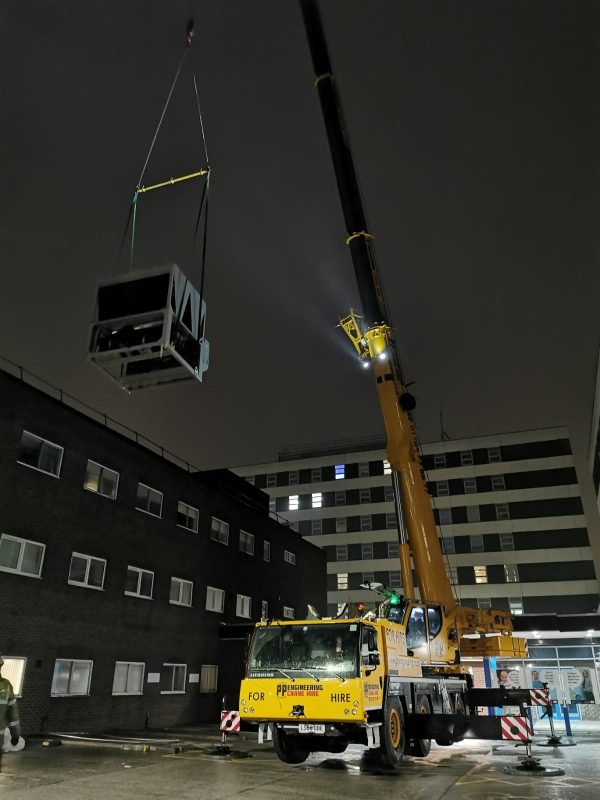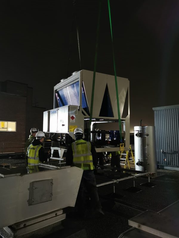 Another successful crane lift where a new Daikin R32 water chiller was lifted into position on the hospital roof early on Sunday morning.